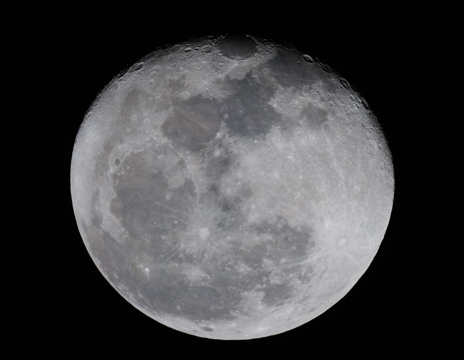 | Though only one day has passed since the previous image, this is obviously no longer a full moon. Click back and forth between this and the previous image to see not only the change in illumination, but also the subtle yet visible effect of libration over just one day. To see the libration, pay attention to how far craters and other features are from the lunar limb in the two different images. |